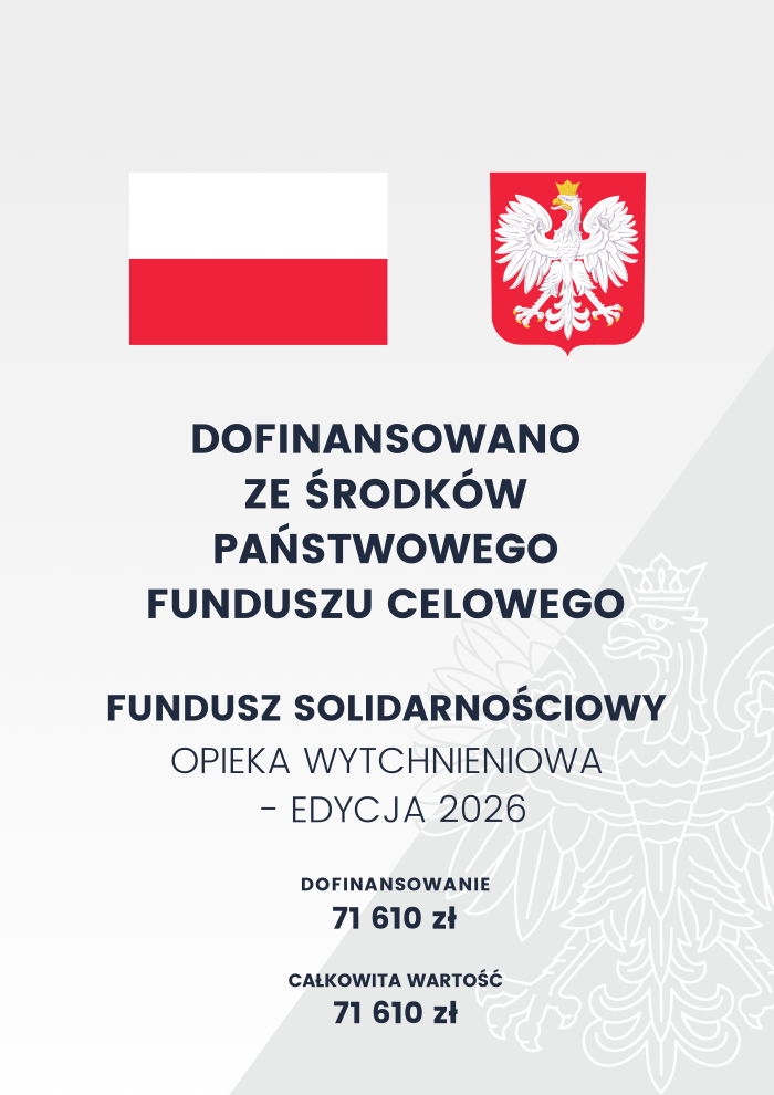 Miejski Ośrodek Pomocy Społecznej w Wysokiem Mazowieckiem w roku 2026 kontynuuje realizację Programu Ministerstwa Rodziny i Polityki Społecznej „Opieka wytchnieniowa” – edycja 2026, który finansowany jest ze środków Funduszu Solidarnościowego. Na realizację Programu w 2026 roku Gmina Miejska Wysokie Mazowieckie otrzymała dofinansowanie w wysokości 71 610zł, całkowita wartość 71 610zł.